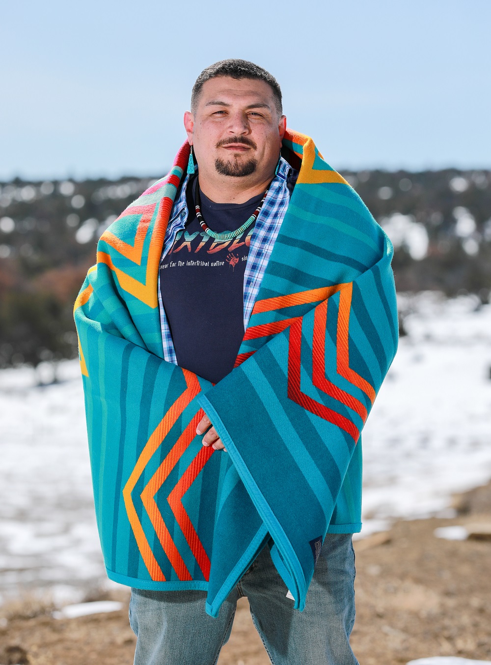 Photo 1: Dustin Lopez with his award-winning Pendleton Blanket Design.
