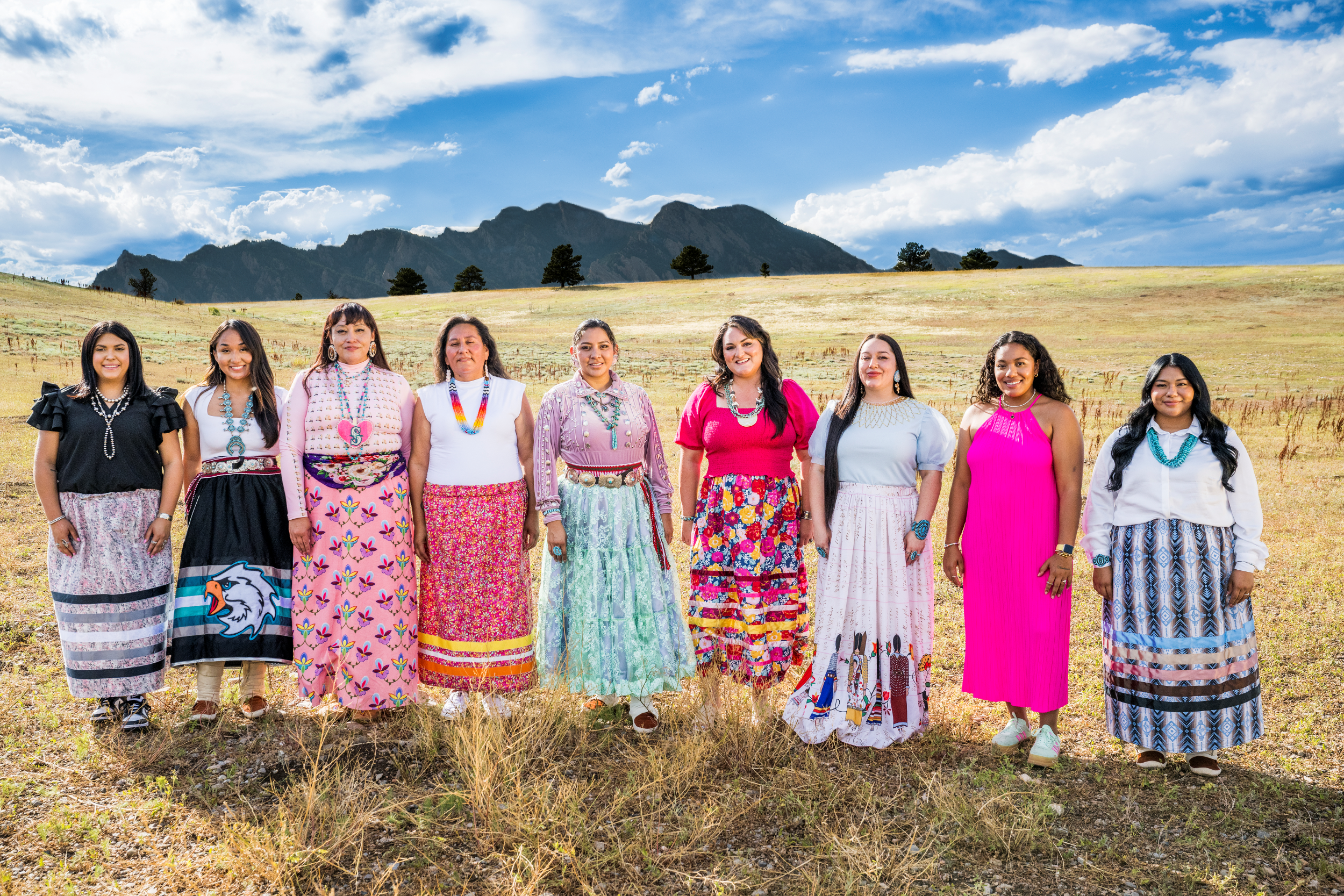 Photo: From Left to Right: Elizabeth Crumm (Wichita and Affiliated Tribes [Wichita, Keechi, Waco, and Tawakonie]), Deanna Teller (Navajo Nation), Cherish GrassRope (Lower Brule Sioux Tribe of the Lower Brule Reservation), Lisa Aimsback (Blackfeet Tribe of the Blackfeet Indian Reservation of Montana), Tasheena Egan (Navajo Nation), Annalise Guthrie (Cherokee Nation), Bridgette Hoshont’omba (Choctaw Nation of Oklahoma), Promise Mace (Santee Sioux Nation), and Krista Goodluck (Navajo Nation)